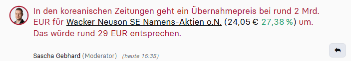 Wie unser Nebenwerte-Experte Sascha Gebhard im stock3 Traders Talks von stock3 Ultimate berichtete, könnte sich ein Angebot auf rund 29 EUR je Aktie belaufen.