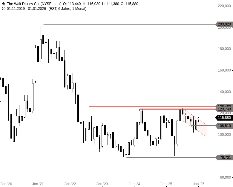 Vom 2021er Allzeithoch bei 203,02 USD hatte sich die Disney-Aktie bis auf Kurse um 78 USD mehr als halbiert. Erst das Tief des Jahres 2020 bei 79,07 USD lockte hinreichend viele Käufer an, die dieser großen Verkaufswelle Paroli bieten konnten. Es folgten mehrere dynamische Ausbruchsversuche über die Oberseite der Range bei 126,48 USD, die jedoch allesamt scheiterten.