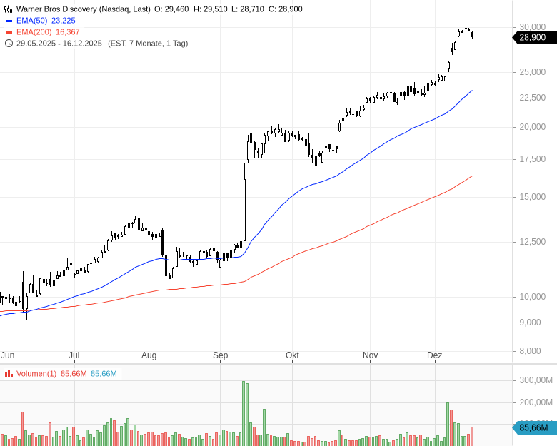 Fazit: Der Bieterkampf um Warner Bros. Discovery bleibt spannend, gerade auch wegen der politischen Dimension: Paramount wird von US-Präsident Donald Trump unterstützt, während der Warner-Bros-Verwaltungsrat den Streaminganbieter Netflix bevorzugt. Der Kurs der Warner-Bros-Discovery-Aktie hat sich angesichts der Übernahmeschlacht seit dem Sommer verdreifacht und notiert inzwischen ungefähr auf Höhe der Übernahmeangebote.