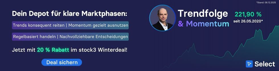 Mit unserem neuesten Service stock3 Select hast Du vollen Einblick in eines meiner Experten-Depots (Trendfolge & Momentum oder Score-Depot), inklusive aller Signale und Updates. Außerdem sicherst Du Dir tägliche Analysen sowie die spannendsten Top-Picks der stock3-Experten und technische Vorteile! Und das Beste: Bei einer Buchung bis zum 28.12. schenken wir Dir 20 % auf das Jahresabo und obendrauf 12 Monate DAX Indizes. Sichere Dir hier Deinen stock3 Winterdeal!