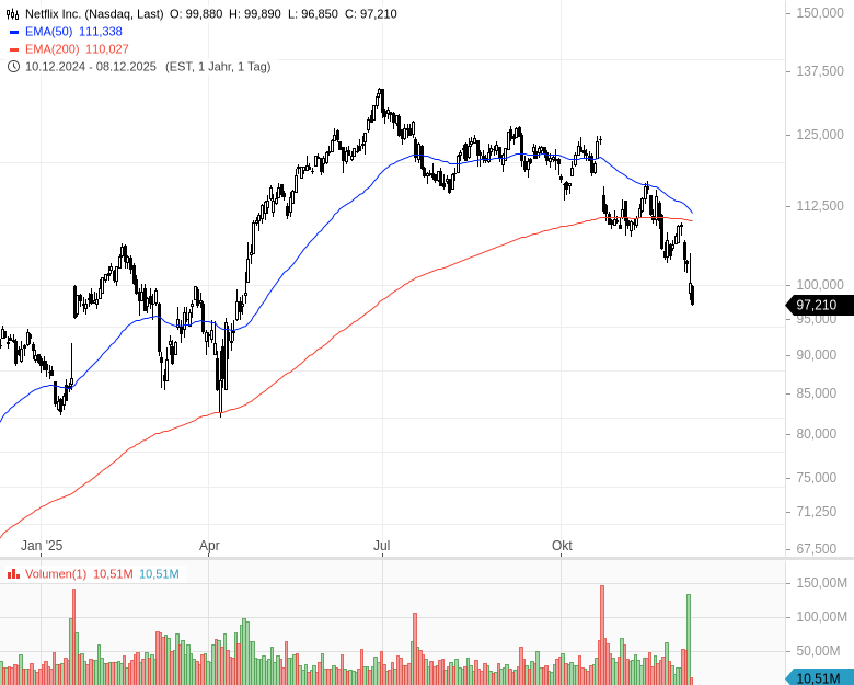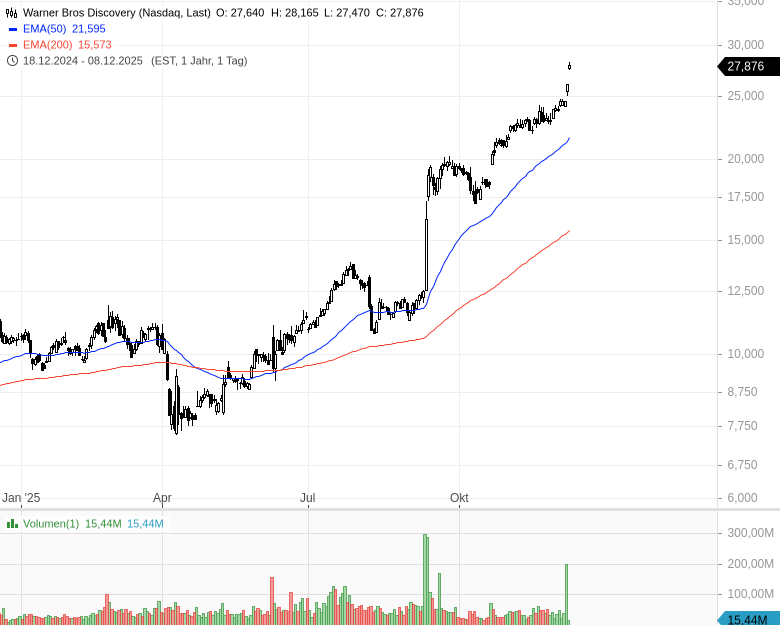 Im heutigen Handel legen die Aktien von Warner Bros Discovery und interessanterweise auch Paramount zu. Netflix büßt dagegen um weitere 3 % ein.