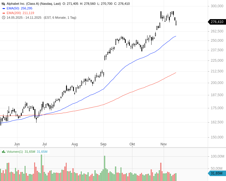 - Alphabet Inc. (Class A)Kursstand: 276,390 $ (Nasdaq) - Zum Zeitpunkt der VeröffentlichungVerkaufenKaufen