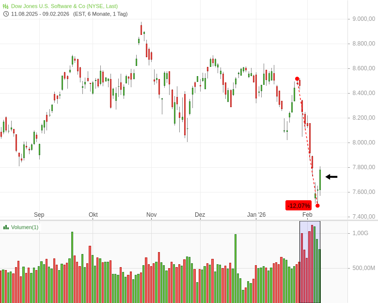 Denn Softwareaktien kamen ab Ende Januar plötzlich massiv unter Druck. Der entsprechende US-Branchenindex fiel sieben Handelstage in Folge, verlor dabei rund -12 %, und das unter sehr hohem Volumen: