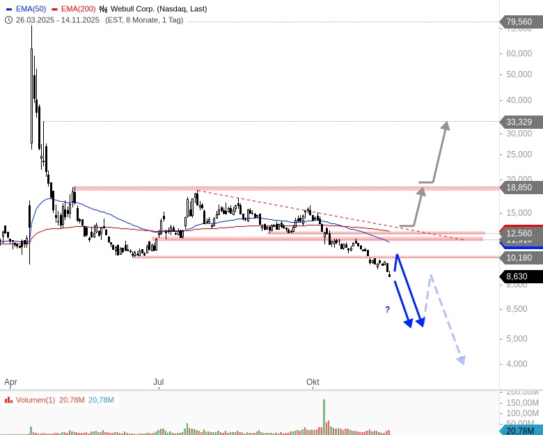 Fazit: Die charttechnische Vorlage bei der Webull-Aktie stimmt kritisch, der Weg des geringsten Widerstandes wäre der nach unten. Um das angeschlagene Chartbild aufzuhellen, wäre ein größerer Kraftakt nötig - angefangen mit einer Rückkehr über die alten Tiefs. Einen Hoffnungsschimmer könnten die am Donnerstag nachbörslich erwarteten Zahlen liefern. Größere Kursausschläge in beide Richtung müssten im Zuge dieses Ereignisses eingeplant werden.