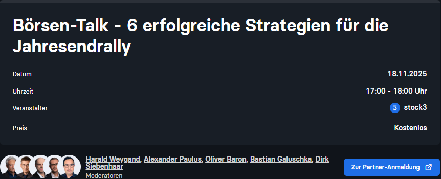 Im morgigen Webinar stellen die Experten ihre aktuellen Strategien vor – kompakt, praxisnah und mit klarem Fokus auf die Chancen der Jahresendrally. Sie präsentieren ihre Depots, erläutern Ansatz, Regelwerk und Zeithorizont und zeigen, worauf sie jetzt setzen. Nicht verpassen! Hier geht's zur kostenlosen Anmeldung:
