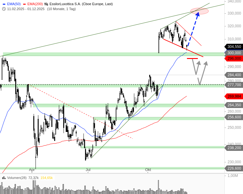 Die EssilorLuxottica-Aktie erreicht im Zuge der zweiwöchigen Abwärtskorrektur im heutigen Tief das obere Ende einer breiten Kreuzunterstützung bei 298 - 302 EUR. Dort liegen das alte Rekordhoch aus dem Februar sowie die Oberkante des Gaps aus dem Oktober, der EMA50 und die Unterkante der keilförmigen Konsolidierungsbewegung.