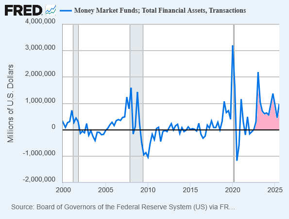 Offenbar stammen also die verkauften Dollarbestände aus dem Devisenmarkt selbst bzw. aus dem Geldmarkt. In letzteren flossen in den vergangenen Jahren riesige Beträge: Mehr als 11 Billionen USD (inflationsbereinigt) waren es in den vergangenen 13 Quartalen (siehe rote Fläche in folgendem Chart):