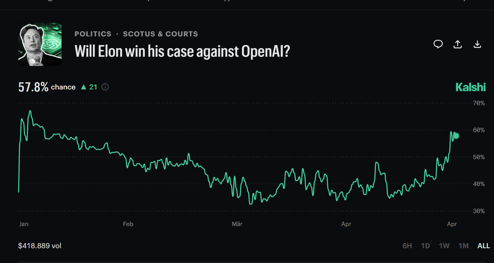 Dass die Wahrscheinlichkeit auf fast 58% gestiegen ist, liegt an mehreren prozessualen Siegen für Musk im Vorfeld: