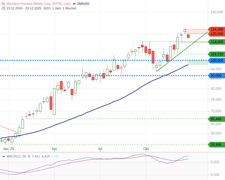 Spannend wird, wie sich Wheaton Precious Metals zum Jahresstart präsentiert. Entscheidend ist, dass der Bereich um 114 USD bei möglichen Rücksetzern verteidigt wird. In diesem Fall bleibt auch der kurzfristige Aufwärtstrend sauber intakt. Klar ist aber auch: Der Aktienkurs steht und fällt mit der weiteren Entwicklung des Silberpreises.