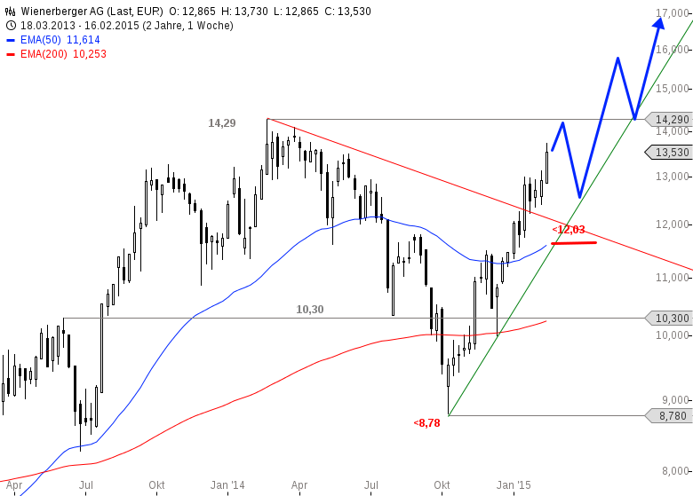 Nach einem Tief bei 8,78 Euro aus dem Oktober 2014 drehte die Aktie von Wienerberger stark nach oben. Mitte Januar 2015 durchbrach sie sogar den Abwärtstrend seit Februar 2014. Damit kam es zu einem weiteren Kaufssignal, welches in den letzten Tagen und Wochen bereits Wirkung zeigte. Denn die Aktie nähert sich dem Hoch aus dem Februar 2014 bei 14,29 Euro an.