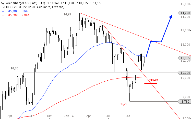 Die Aktie von Wienerberger befindet sich seit dem Tief bei 8,78 Euro aus dem Oktober 2014 in einer Erholung. Dabei kletterte die Aktie auf ein Hoch bei 11,51 Euro, musste danach aber einen kleinen Rückschlag hinnehmen. Dabei verteidigte der Wert in der letzten Woche den Unterstützungsbereich zwischen 10,30 und 10,06 Euro. In dieser Woche kommt es zu weiteren Käufen.