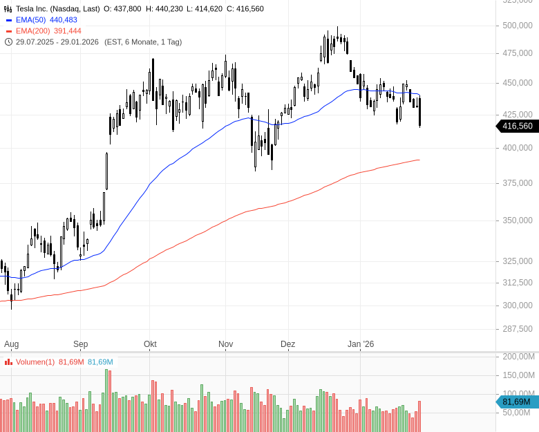- Tesla Inc. - WKN: A1CX3T - ISIN: US88160R1014 - Kurs: 416,350 $ (Nasdaq)