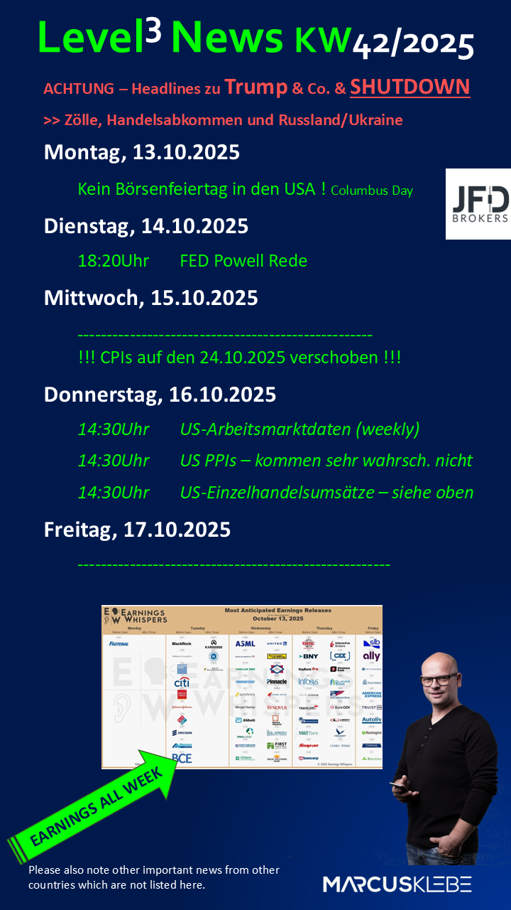 Die neue Handelswoche startet mit spürbarer Zurückhaltung an den Märkten. Grund dafür ist vor allem der anhaltende US-Government Shutdown, der weiterhin große Teile der US-Statistikbehörden lahmlegt. Dadurch werden vorerst keine wichtigen Wirtschaftsdaten veröffentlicht. Nachdem die Verbraucherpreise (CPI) bereits offiziell verschoben wurden, ist nun auch davon auszugehen, dass die Erzeugerpreise (PPI) sowie die wöchentlichen Arbeitsmarktdaten nicht wie geplant erscheinen werden.
