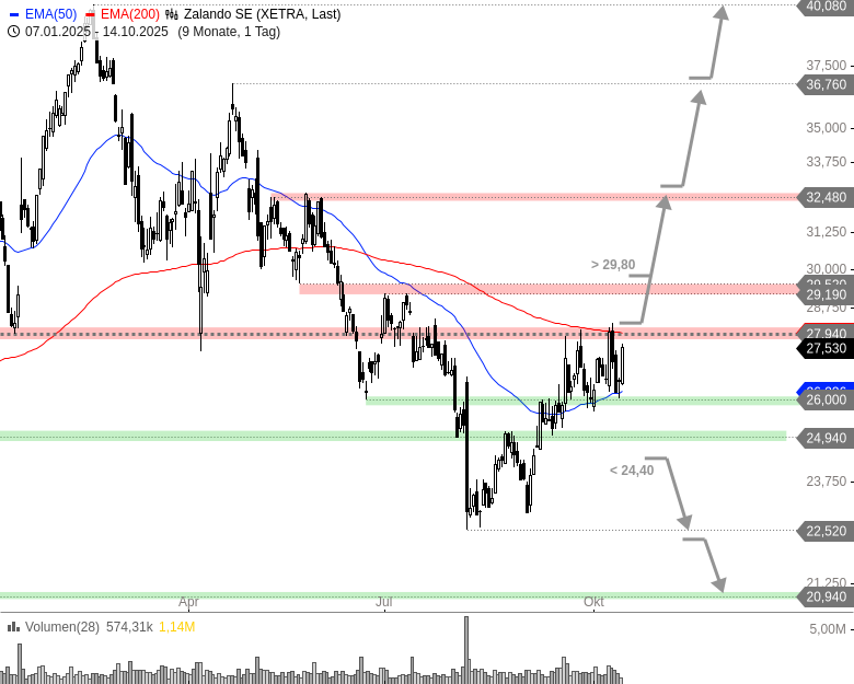 Fazit: Der jüngste Erholungsansatz stimmt optimistisch. Allerdings müssen die Prognoseszenarien noch neutral gehalten werden, solange die Zalando-Aktie unterhalb der zentralen Hürde bei 28 EUR gehandelt wird. Erst mit einem Ausbruch darüber würden Kaufsignale entstehen und weitere Erholungen wahrscheinlicher werden.