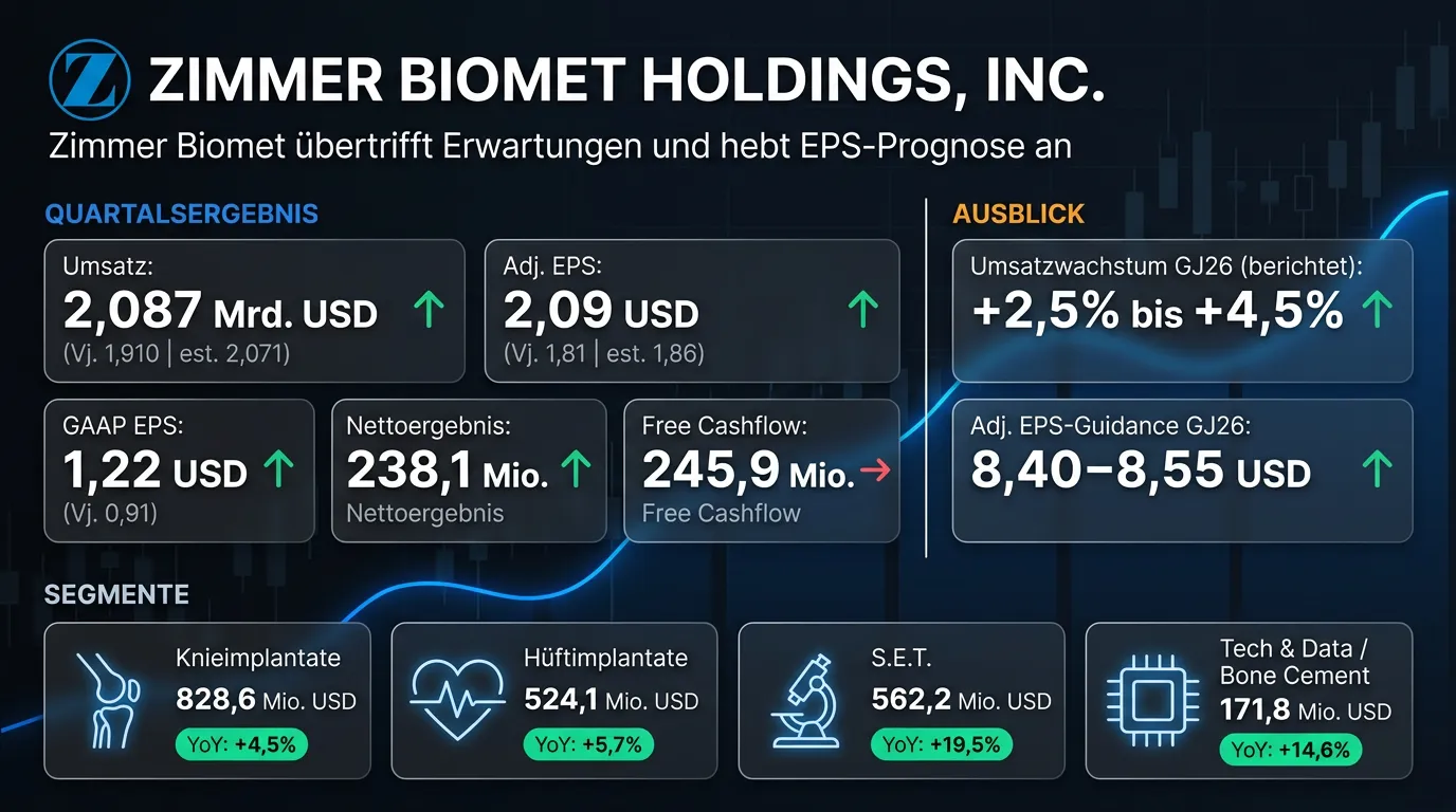 Der Orthopädie-Medizintechnikkonzern Zimmer Biomet hat im ersten Quartal 2026 einen Umsatz von 2,087 Mrd. USD erzielt, ein Plus von 9,3 Prozent gegenüber dem Vorjahreszeitraum und leicht über den Analystenerwartungen von 2,071 Mrd. USD. Das bereinigte Ergebnis je Aktie stieg um 15,5 Prozent auf 2,09 USD und übertraf damit die Konsensschätzung von 1,86 USD deutlich. Das GAAP-Nettoergebnis legte auf 238,1 Mio. USD zu, der operative Cashflow betrug 359,4 Mio. USD. Für das Gesamtjahr 2026 hebt Zimmer Biomet die Guidance für das bereinigte verwässerte EPS auf 8,40 bis 8,55 USD an (zuvor: 8,30 bis 8,45 USD), während die Umsatzwachstumsprognose von 2,5 bis 4,5 Prozent (berichtet) bestätigt wird.