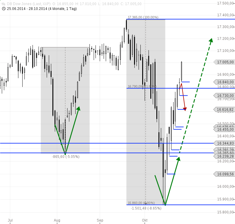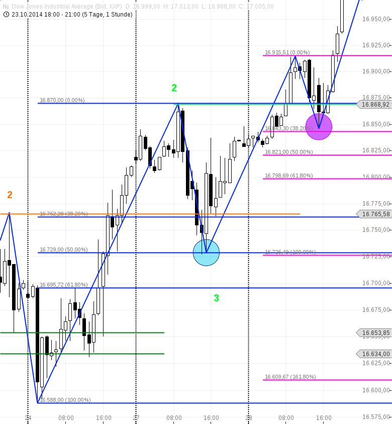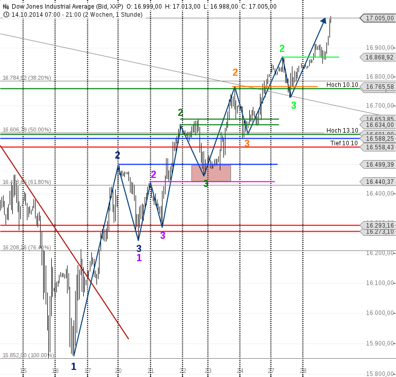 Schaut man sich noch mal den Trend seit dem Doppeltief vom 16.10.2014 an, dann ist die Bewegung wirklich perfekt gelaufen. Es kam zu einer verschachtelten 1-2-3 Formation (in pink), die innerhalb der etwas größeren blauen 1-2-3 Formation gelaufen ist. Die jeweiligen nachfolgenden Punkte 2 und 3 stehen in einem sehr guten Verhältnis zu einander. Nachdem ein Punkt 2 = orange erfolgreich überschritten wurde, kam es zur Korrektur, die bis leicht in den alten Punkt 2 = orange ging, um danach wieder direkt den letzten Punkt 2 = hellgrün zu überschreiten. Mit diesem sehr guten Verlauf hat der Dow Jones gerade 73,6 % der letzten Abwärtsbewegung vom Allzeithoch aus gesehen neutralisiert.