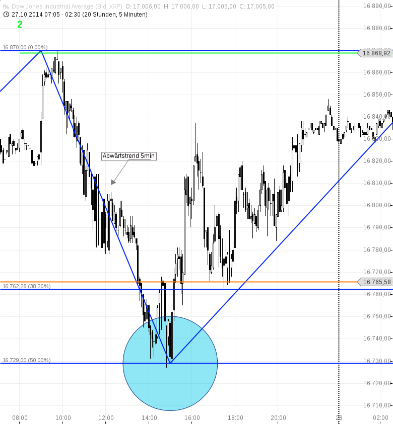 Ich habe in den letzten Webinaren im 60min Chart geschaut, wo eine Korrektur beendet sein könnte und dazu die Bewegung ins Fibonacci genommen. Gestern hat der Dow jones im Tief 50 % korrigiert = hellblauer Kreis und im heutigen Handel wurde die gestrige Bewegung zu fast 38,2 % korrigiert = pinker Kreis. Geht man danach vom 60min Chart in den 5min Chart, wird man oftmals einen kleinen Abwärtstrend sehen und man muss meist gegen diesen traden um später in die Bewegung im Stundenchart zu kommen. Gestern ist mir das gut gelungen. Im heutigen Handel kam die Bewegung erst nach Webinarende.
